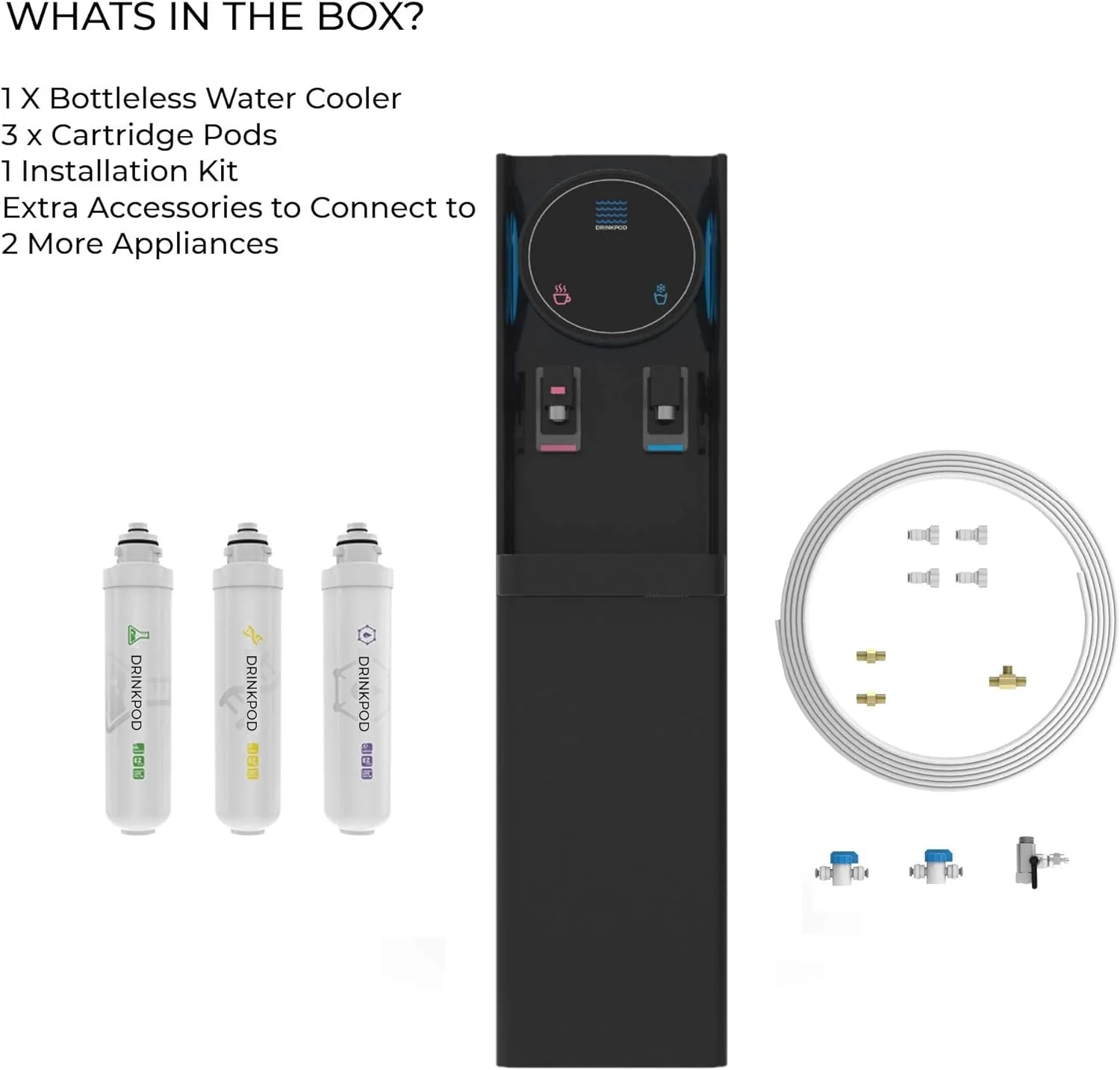 - NEVER BUY BOTTLED WATER AGAIN: Just one set of ULTRA 3 Cartridge pods in your Drinkpod Bottleless Water Cooler Dispenser is capable of producing up to 7.200 half liter bottles worth of delicious water.