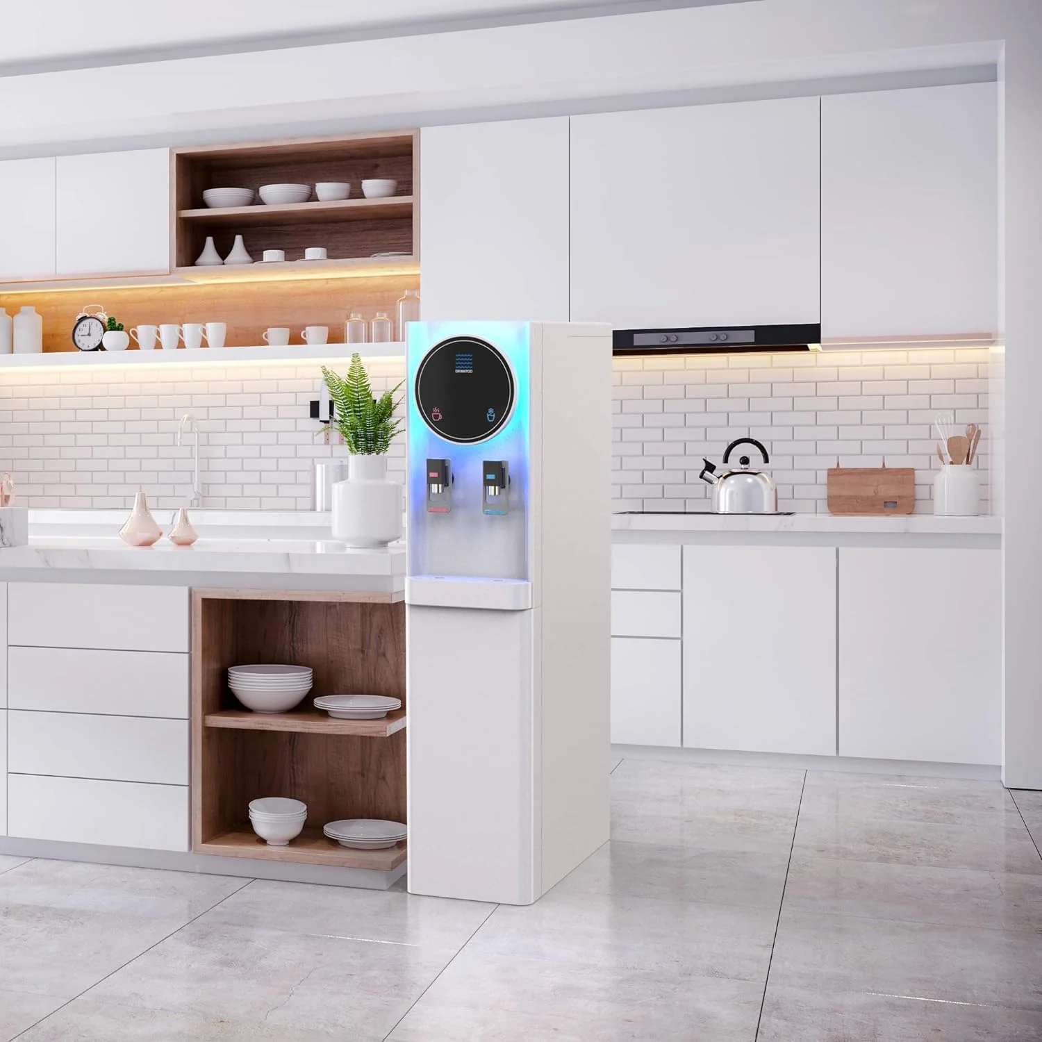 - UPGRADE YOUR KITCHEN DÉCOR: This sleek water cooler system with the unique Blue LED Accent Light will add elegance to your home kitchen or office. No more bulky water cooler dispensers or space consuming 5 gallon water bottles.