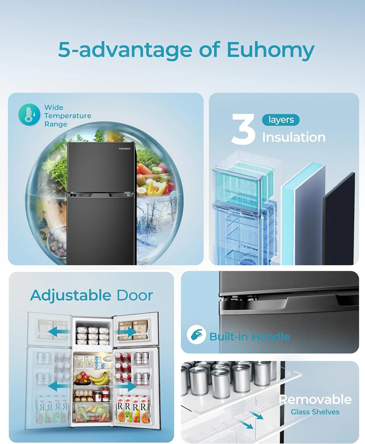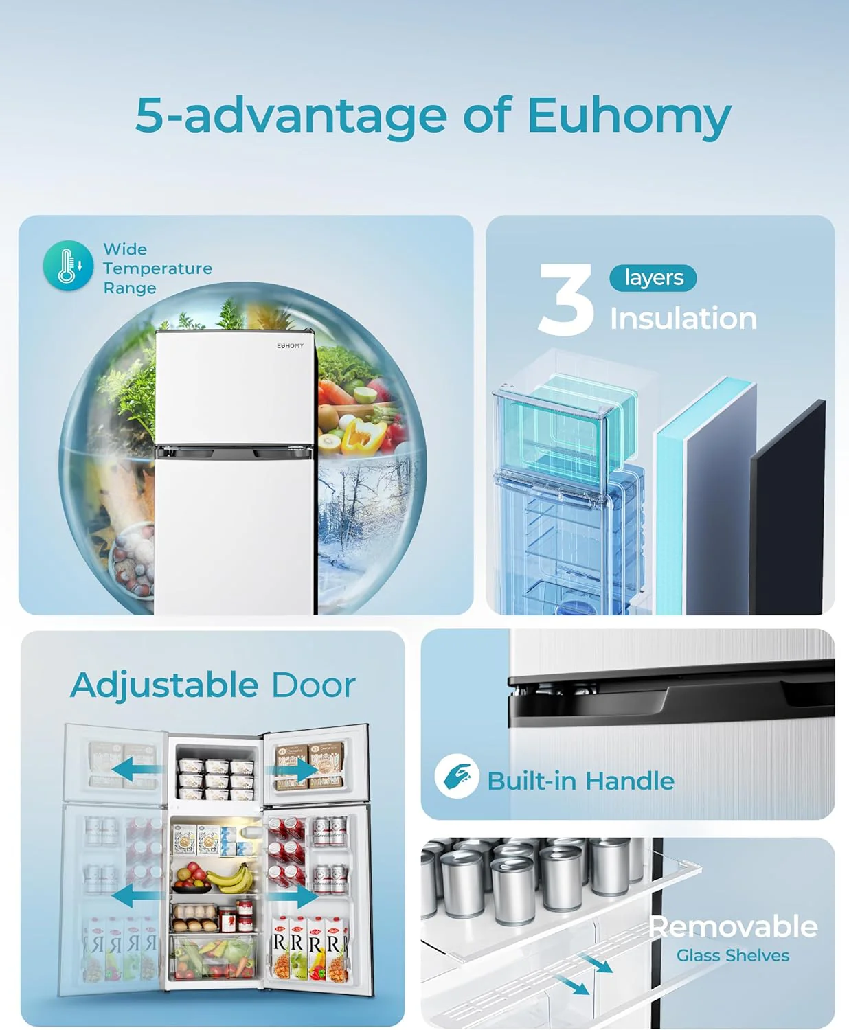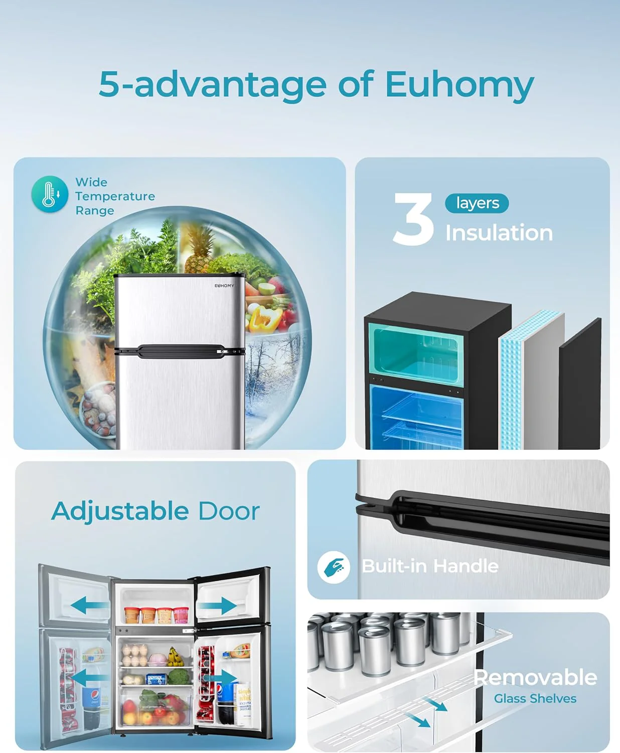 • THE PERFECT COMBINATION OF FRIDGE-FREEZER - Euhomy mini fridge with freezer combines the advantages of fridge and freezer to design the dorm fridge with freezer 2 door. Mini frdige has two storage zone at the same time. 0.96 Cu.Ft of freezer zone can be used to store ice cream or frozen food. 2.24 Cu.Ft of fridge zone can be used to preserve fresh fruits. vegetables or refrigerated drinks. When you buy a Small fridge it is equivalent to buying a fridge and a freezer at the same time