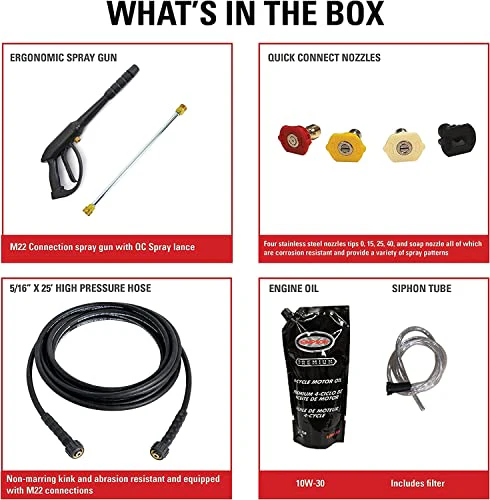 - Includes Quality Simpson Accessories: 5/16-inch x 25-feet MorFlex high-pressure hose is non-marring. flexible. abrasion-resistant; 4 Quick connect nozzle tips: 0°. 15°. 40°. Soap to use for a variety of cleaning applications; 16-inch steel wand/lance; Ergonomic spray gun