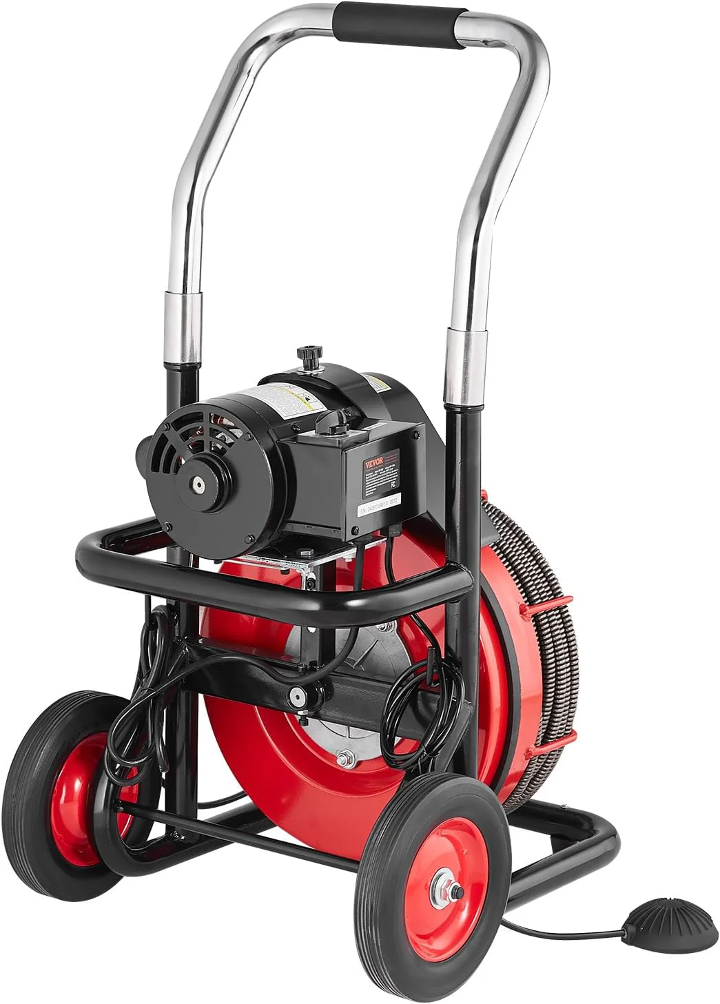 • Drain Cleaner Machine 100FT x 1/2 Inch, Auto Feed Sewer Snake Auger on Wheels, 550W Portable Drain Cleaning Machine with 8 Cutters & Air-activated Foot Switch for 2" to 4" Pipes
