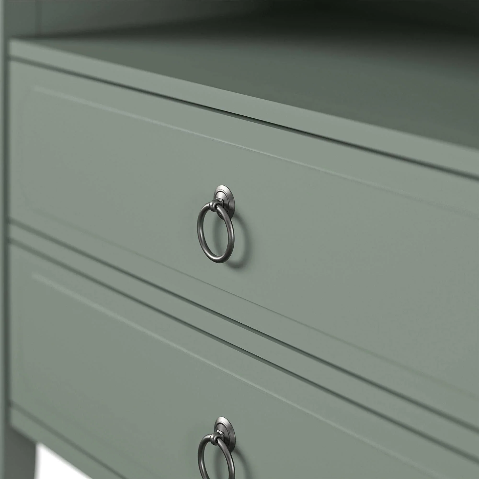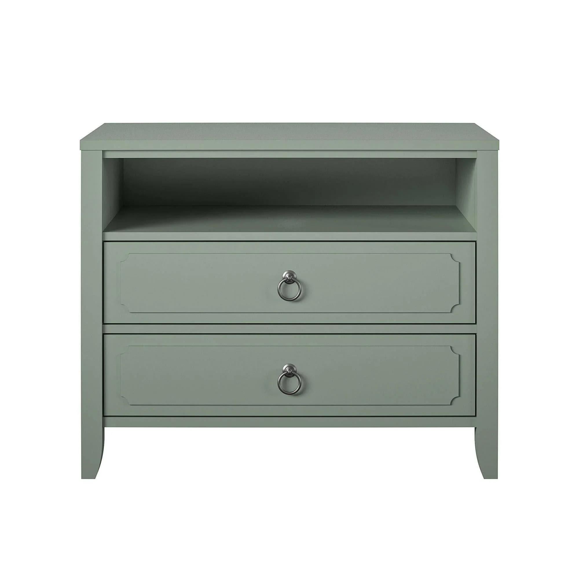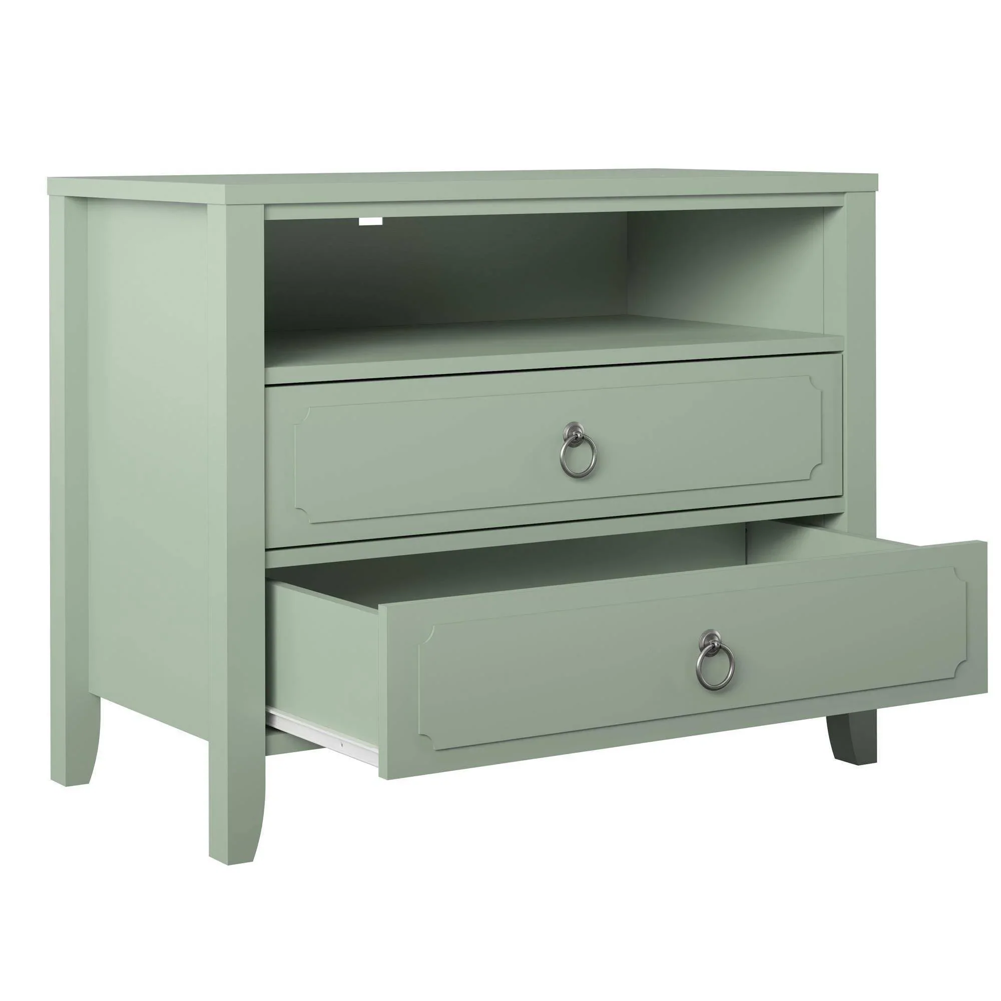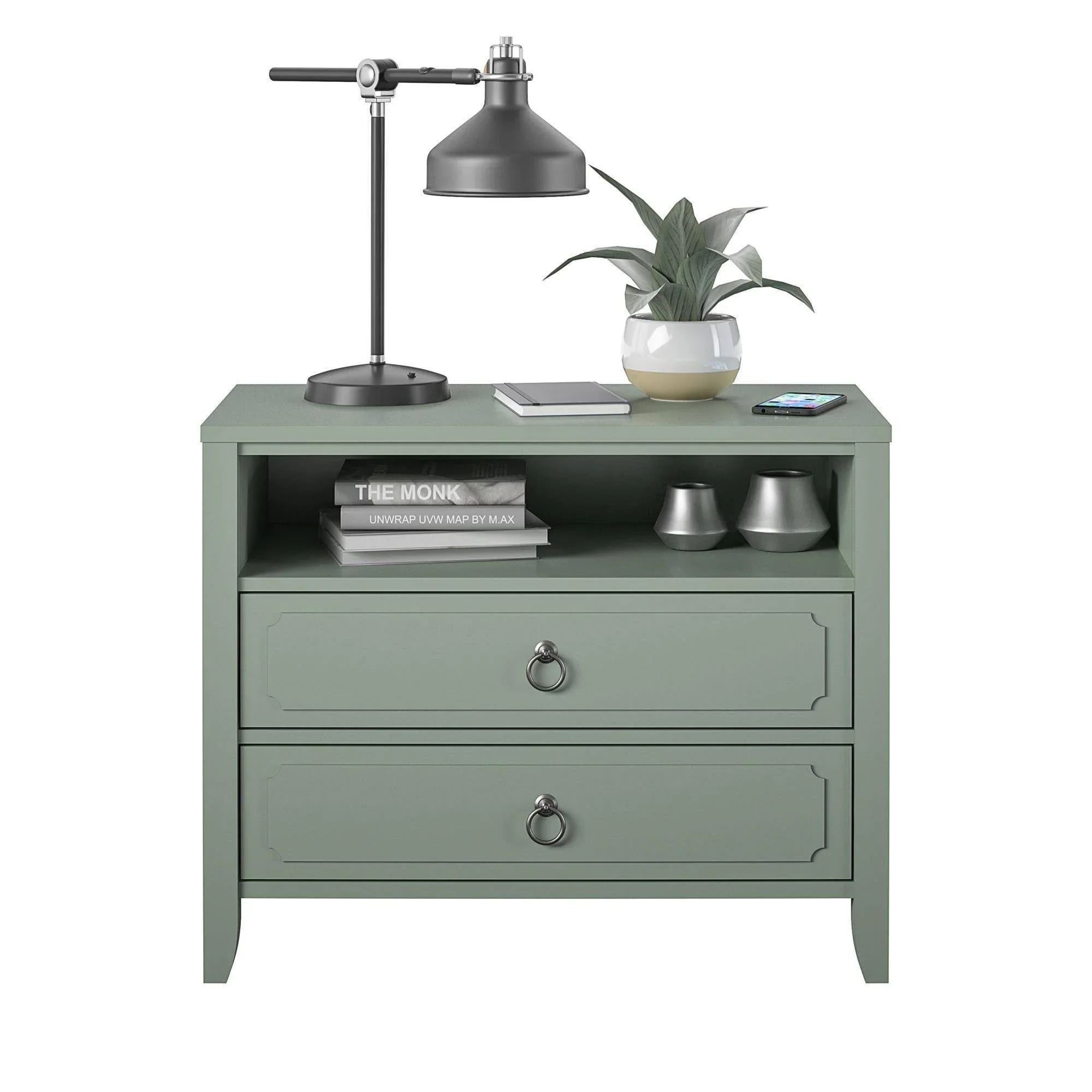 Add an elegant style to your bedside with the Drawer Nightstand. The soft green finish on the painted MDF and real wood legs adds a fun pop of color to your room and the ring pulls and decorative drawer front molding add a sophisticated look. The spacious tabletop offers plenty of space for a side lamp, cell phone, and other nighttime essentials. The open cubby is perfect for organizing books and magazines to keep your tabletop clutter free. Store away stationary, reading glasses, and extra cords in the 2 lower drawers that feature durable metal slides. Two adults are recommended to assemble. Once assembled, the Nightstand measures to be 24H x 29.7W x 15.8D.