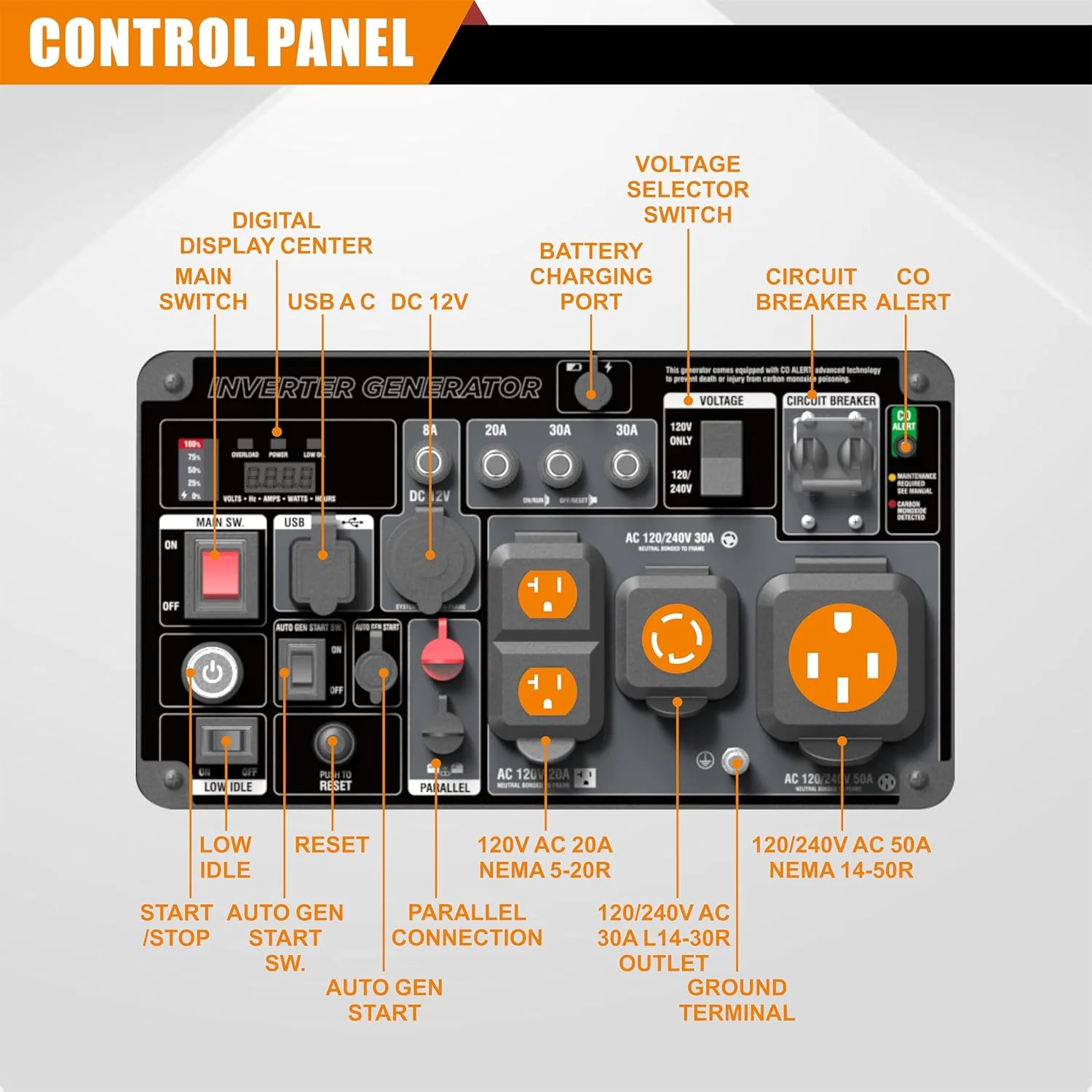 • 【Intelligent Control Panel. 2 wire Start】: The generator's control panel combines multiple functions with cutting-edge technology and user-friendly design. Direct current outputs paired with USB ports meet the charging needs of various digital devices. Multi-functional digital displays provide real-time operational parameters for easy monitoring. Features such as battery charging port. 2 wire automatic start/stop to charge solar batteries. and parallel operation capabilities offer intelligent solutions for complex power scenarios. The CO alarm function ensures safety. while voltage switching accommodates different electrical standards for seamless operation.