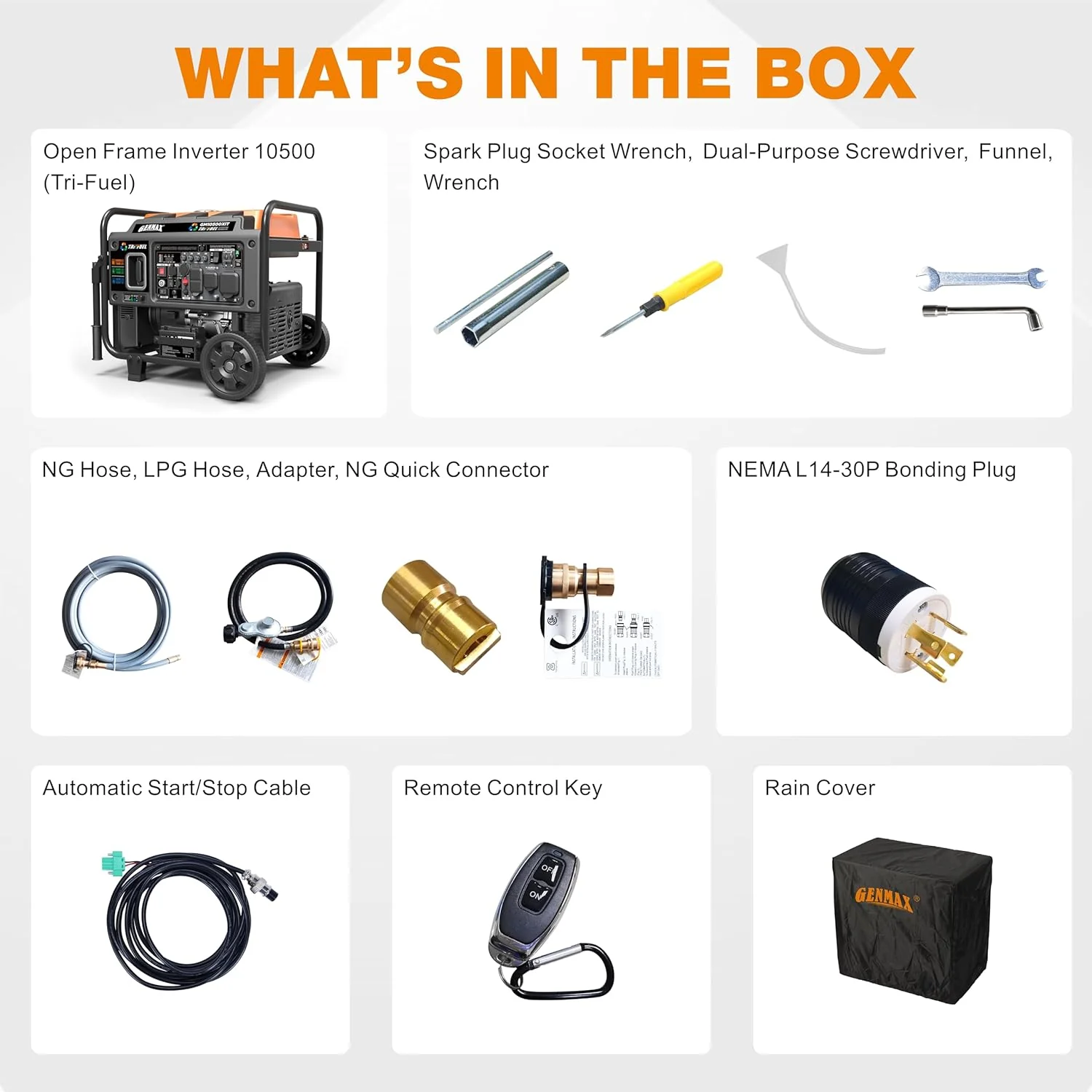 • 10500 Peak Watt Tri Fuel Open Frame Inverter Generator,with ATS,Quiet Technology,CO Sensor,digital display and 50A,Ideal for Home backup,contruction site and RV Camping.