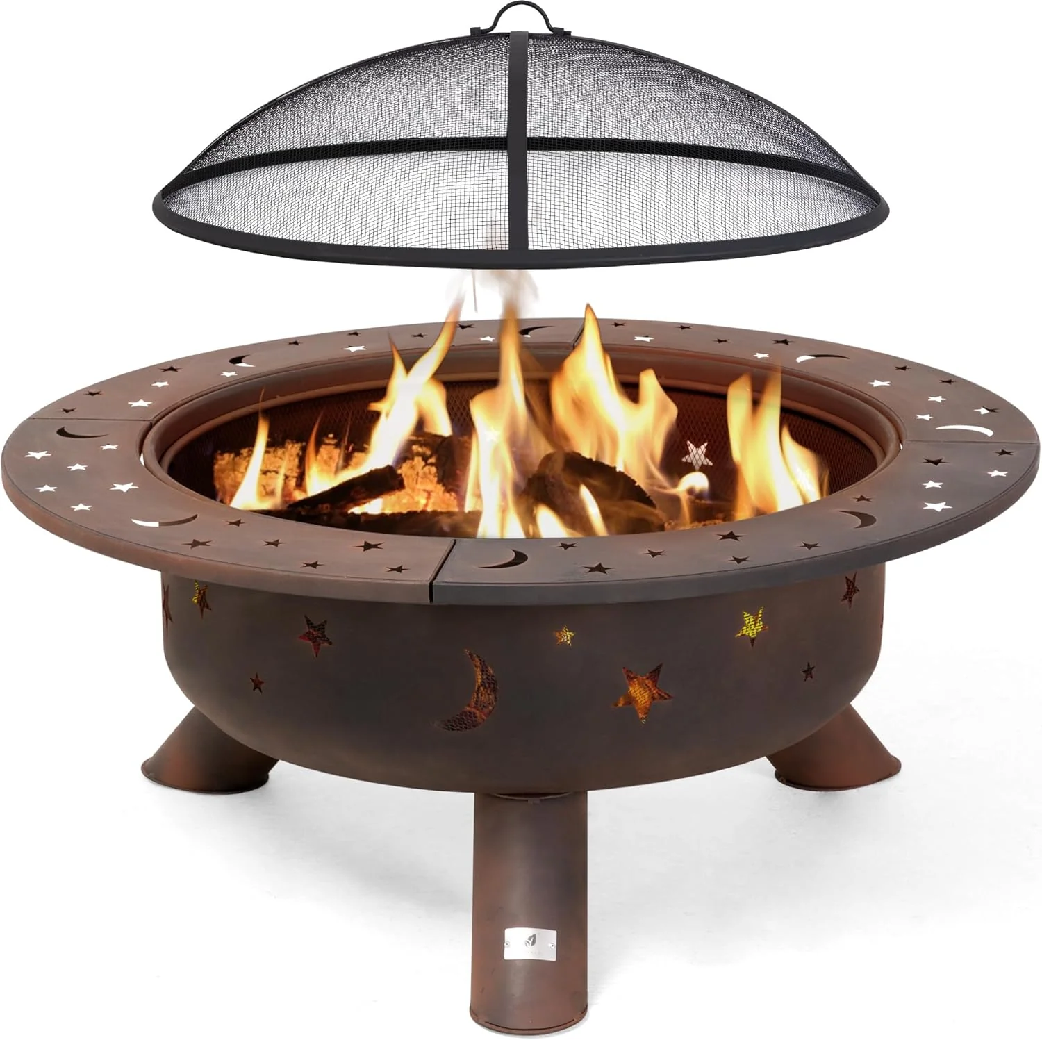 SUNCREAT 42” Patio Fire Pit Wood Burning with Mesh Spark Screen, Bonfire Outdoor firepit with Fireplace Poker, Black