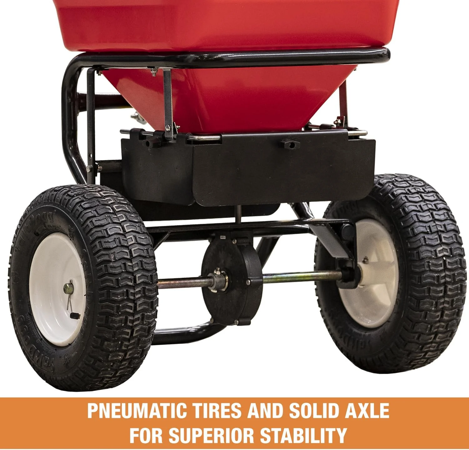 • All Season Walk Behind: This easy to assemble manual salt spreader has a 100 pound capacity so you can cover larger areas using fertilizer and grass seed in the Spring and then switch to bagged salt or ice melt; Adjustable spread range of up to 24 feet