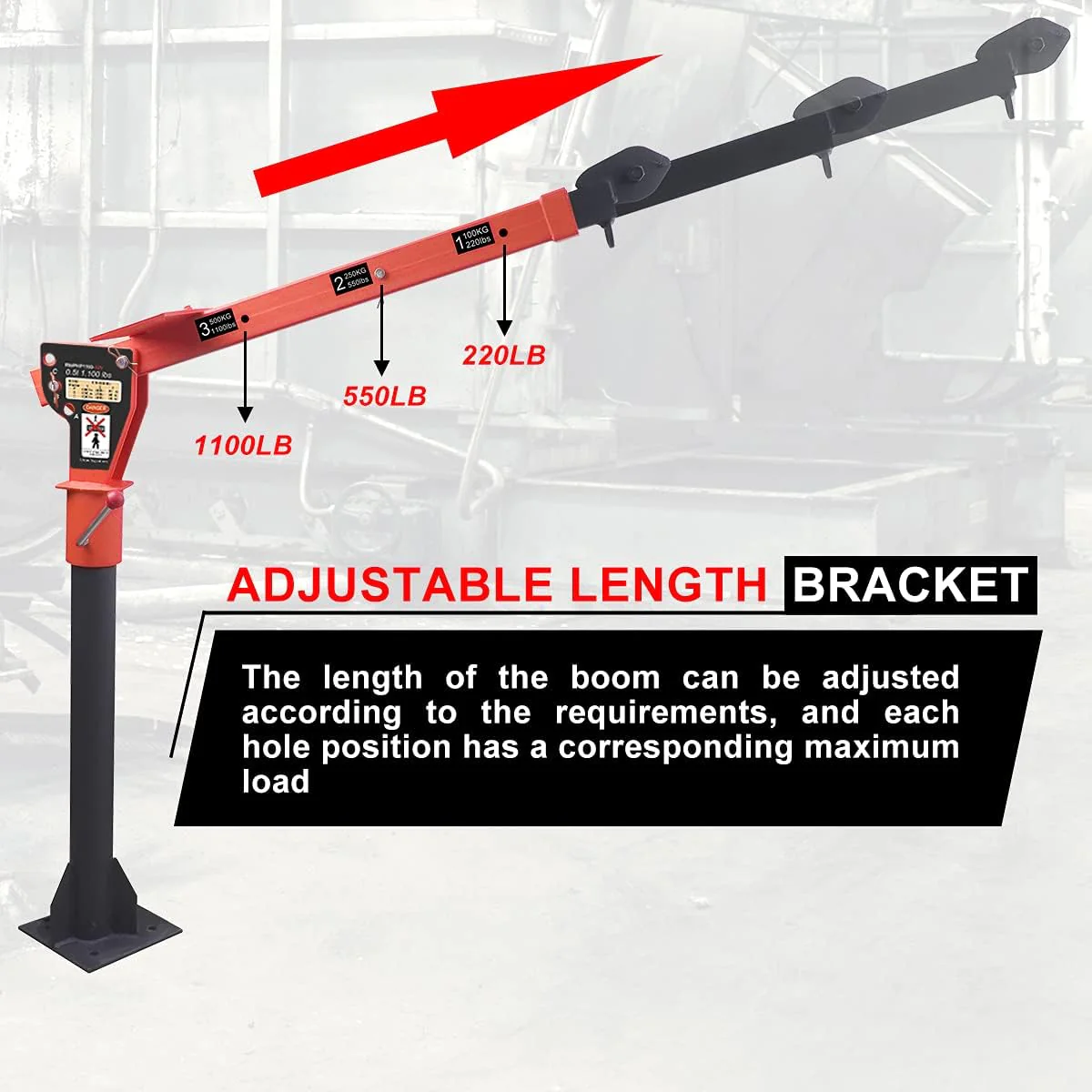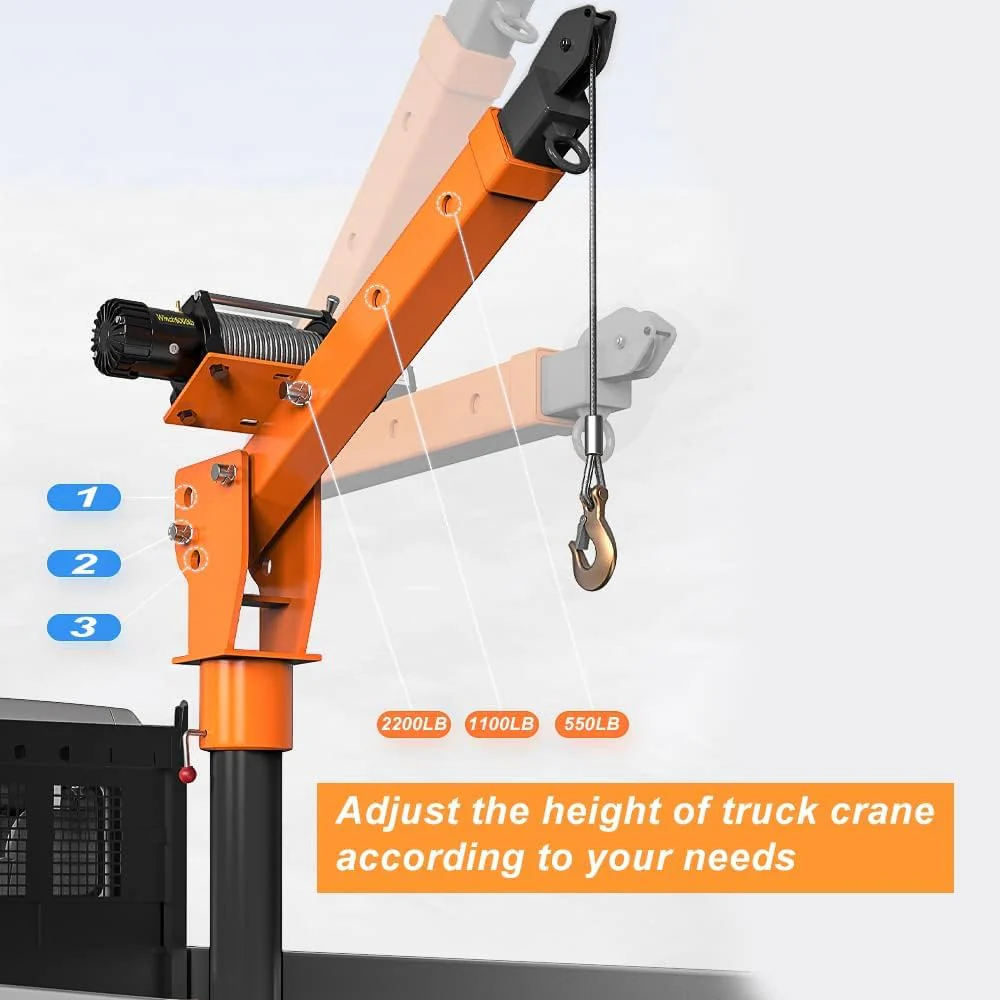 • Boom reach: Three boom capacities: 220. 550 and 1100 pounds ; truck crane has boom with adjustable length. which can reach from 46.06" to 57.09" to meet your requirements
