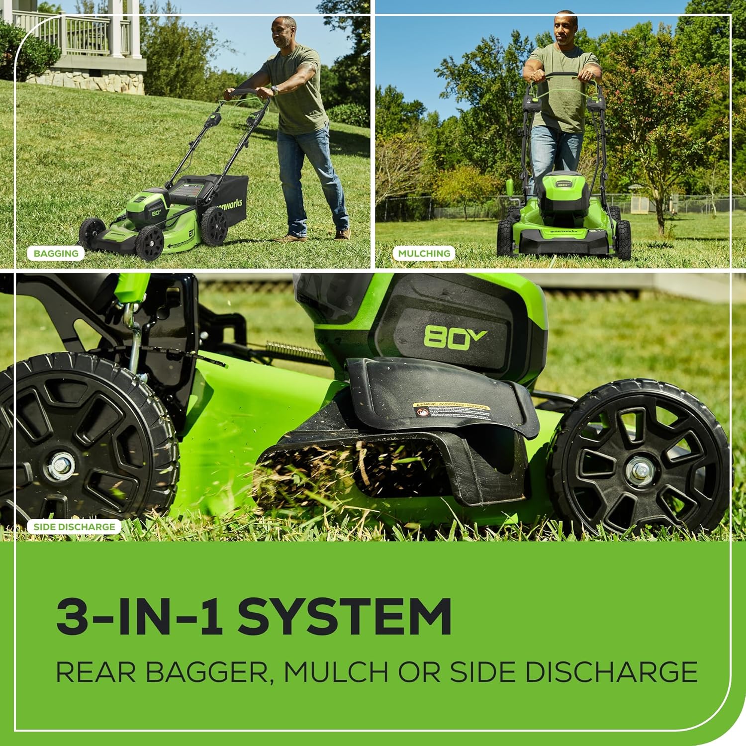 • CORDLESS LAWN MOWER – Get more done, faster, with Greenworks electric lawn mowers. This 80V self-propelled mower provides the power you need with up to 45 minutes of run-time on a fully charged 4.0Ah battery (varies based on grass condition and operator technique)