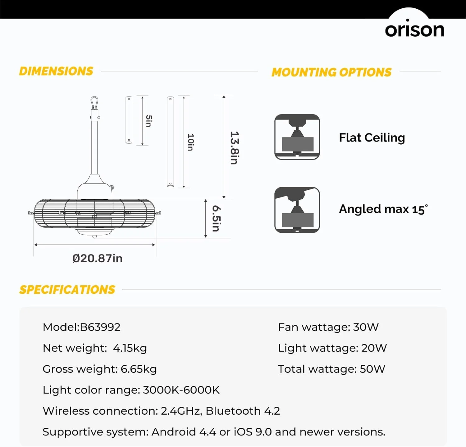• High Air Volume Fan with Lighting: With 6- speed adjustment. 3 color temperatures ranging from 3000K to 6000K. 10%-100% stepless brightness adjustment. reverse mode. night mode and sleep timer settings. this Orison outdoor fan meets all your needs.