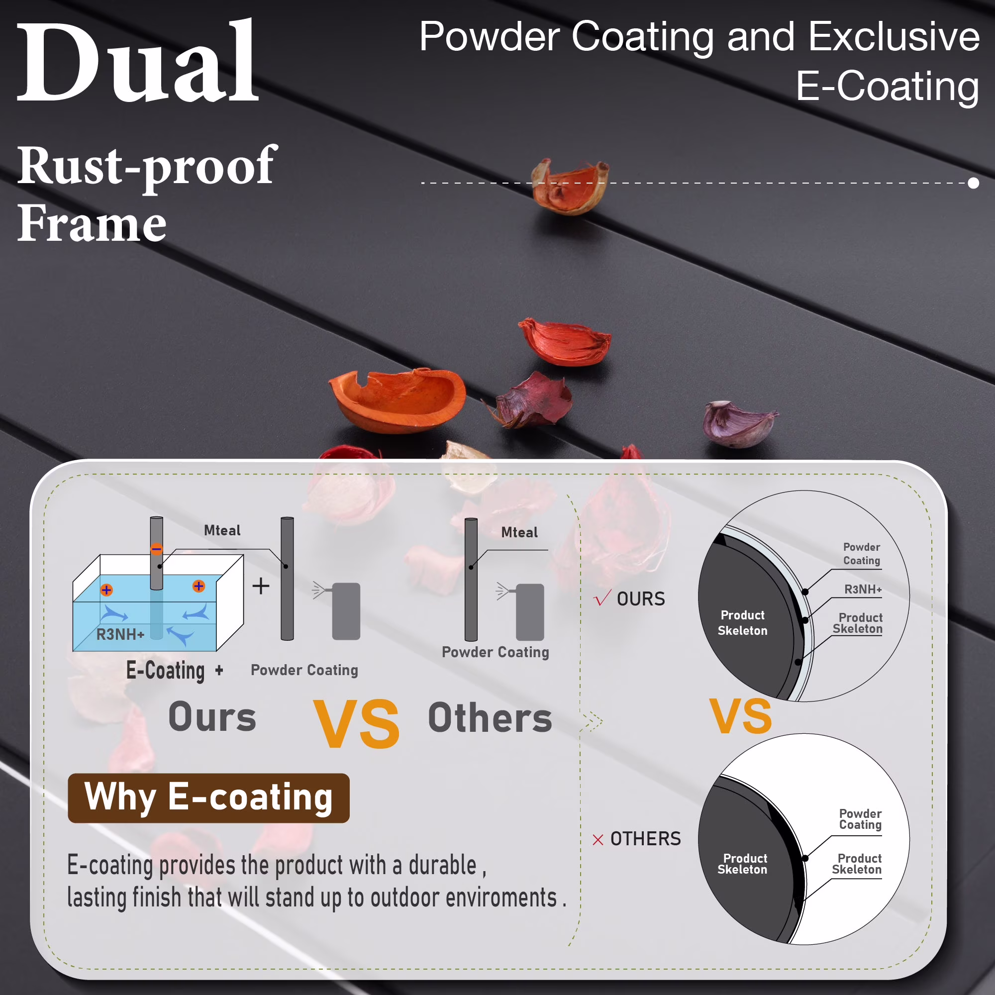 • Stable and Durable: Crafted from a heavy-duty steel frame with E-coating and a powder-coated finish, this outdoor dining set is rust-resistant, all-weather-compatible, and easy to clean. Its stable structure makes it ideal for outdoor use.