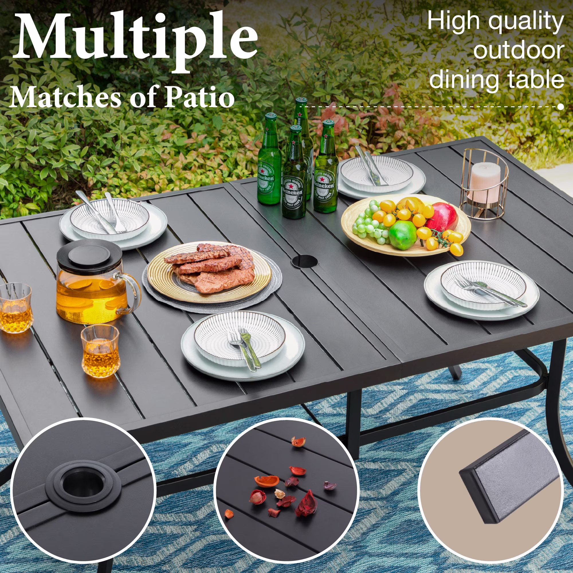 • Outdoor Dining Table for 6: The large outdoor table features a modern slatted tabletop and bow-shaped legs, providing enhanced stability and ample legroom. An umbrella support with an adjustable diameter of 1.57" to 1.9" adds extra lateral support for your umbrella.