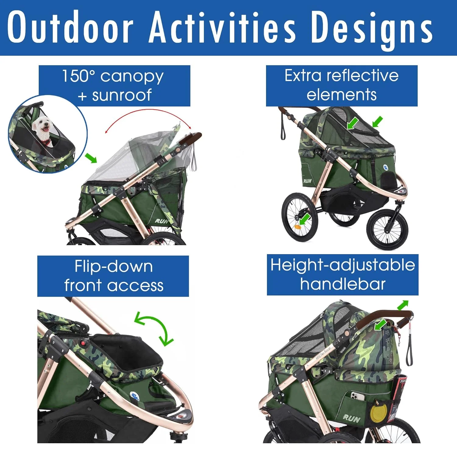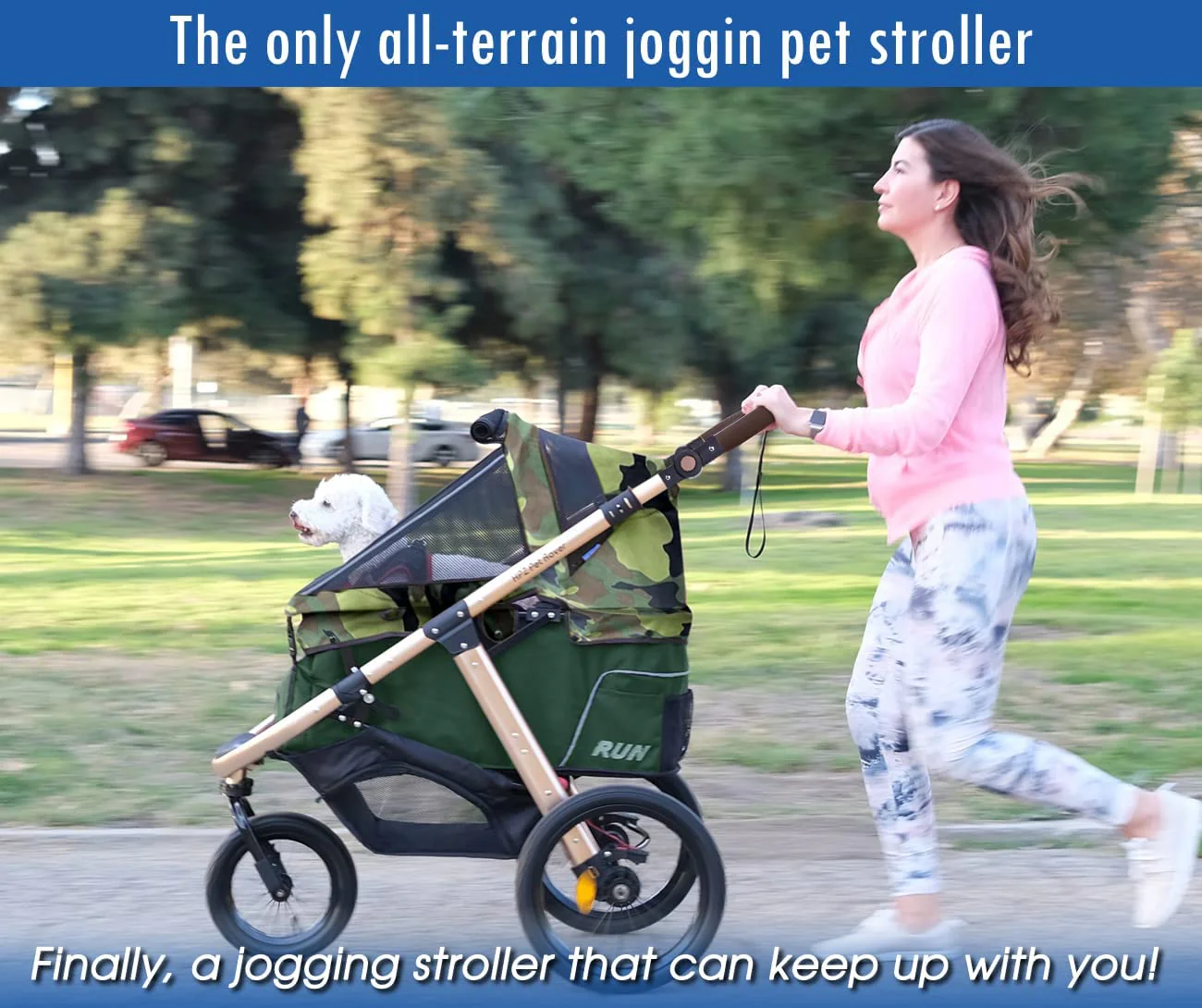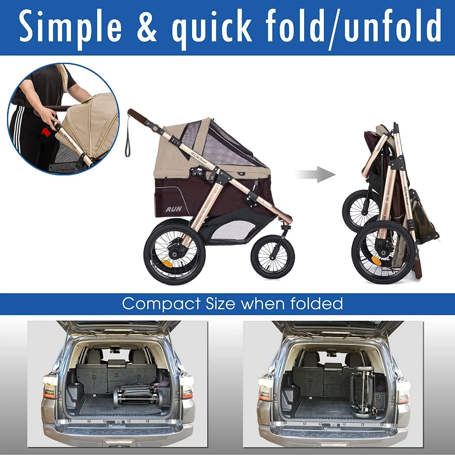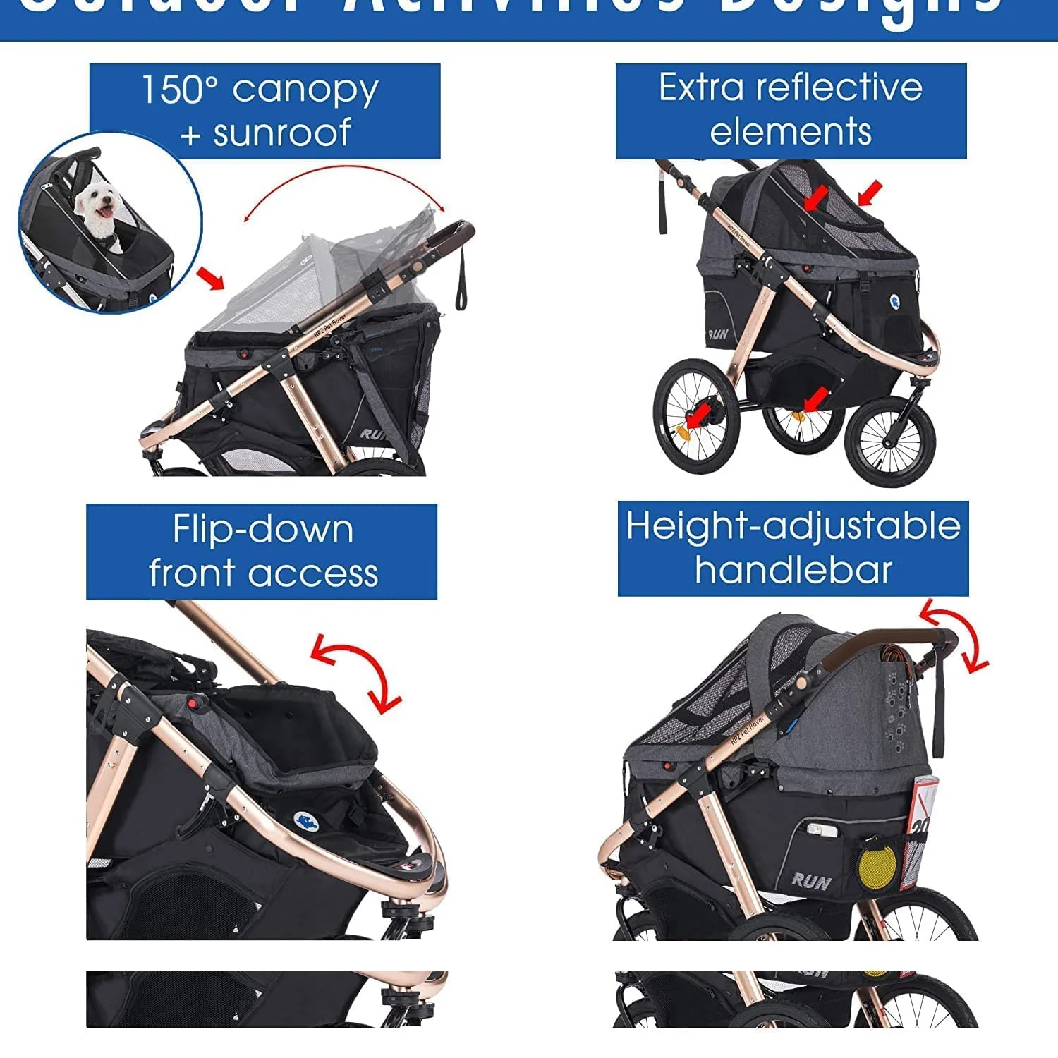 Specifically designed for active families with pets. this high-performance stroller is perfect for urban exploration or jogging on your favorite path. It's the only all-terrain jogging pet stroller available equipped with 3 modes of transport - RUN. JOG and WALK. so you can change your pace to match your workout. Its aerodynamic design is excellent for combating wind resistance when jogging with your beloved pets. The HPZ Pet Rover Run features three large air-filled rubber tires that absorb impact for both pet and parents alike making for an exceptional smooth and stable ride. The rigid yet light lightweight aluminum chassis holds up to 50 lbs and has two interior tethers for multi-pet families to enjoy outdoor activities. HPZ designed the Pet Rover Run with comfort and ease in mind. it features an ergonomic adjustable handlebar to accommodate any stride so it helps you and your pets get outside and enjoy exercising in the fresh air!