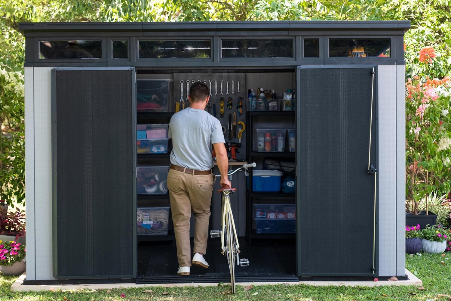 • 11x7 Modern Resin Outdoor Storage Shed Kit-Perfect to Store Patio Furniture, Garden Tools Bike Accessories, Beach Chairs and Lawn Mower