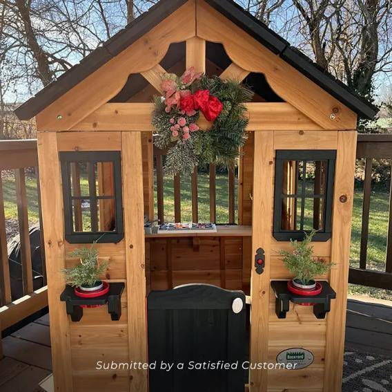 This product is fun for the whole family. It will look excellent in any outdoor space and has wide windows that allow plenty of natural sunlight and breezes in. Its front is adorned with flower pot holders and a cute half-door for a simple. yet elegant style that may even become a centerpiece of your yard. On one side of this Backyard Discovery playhouse. there is a snack window for serving up cool drinks on a summer day and all kinds of other play.