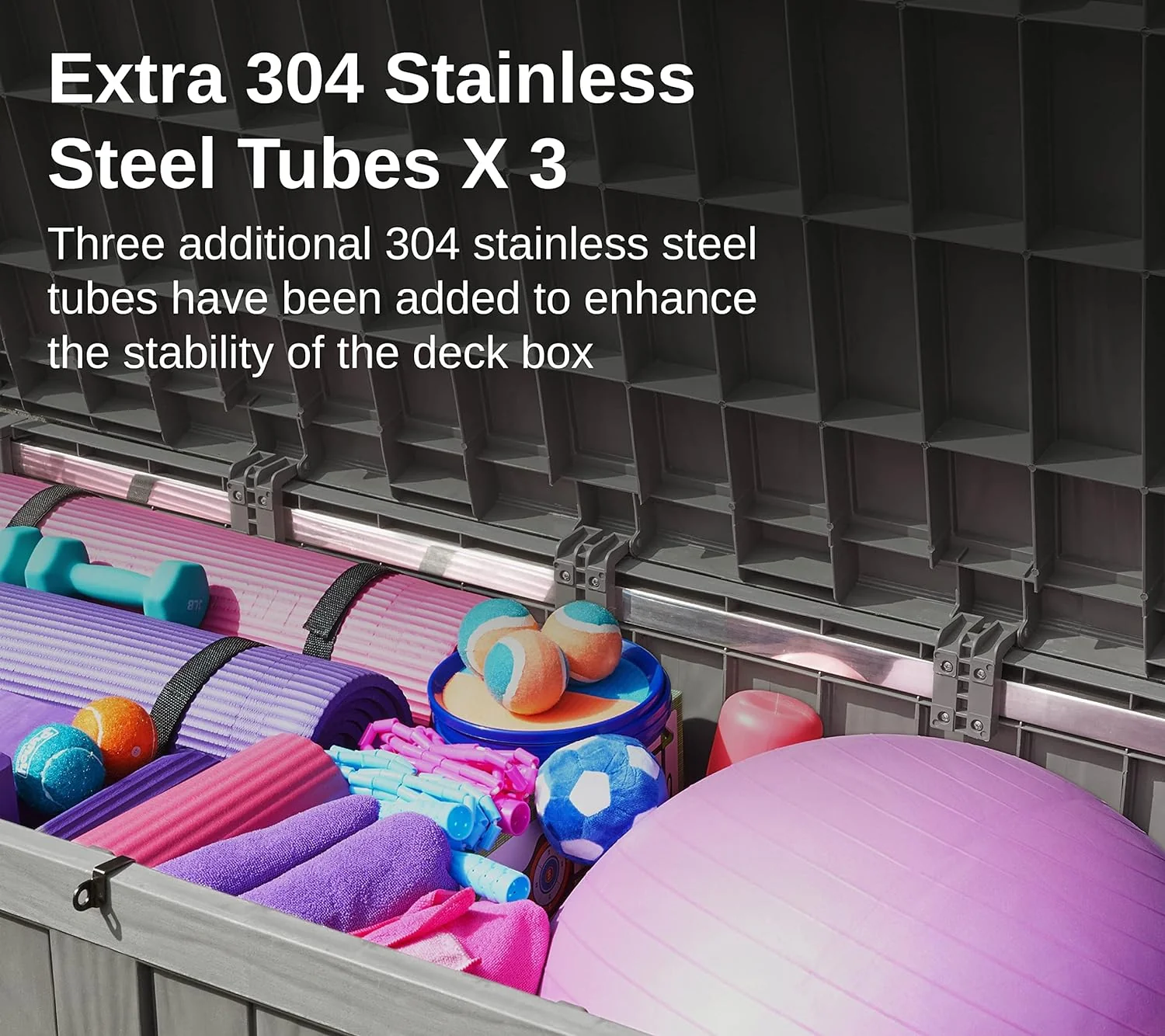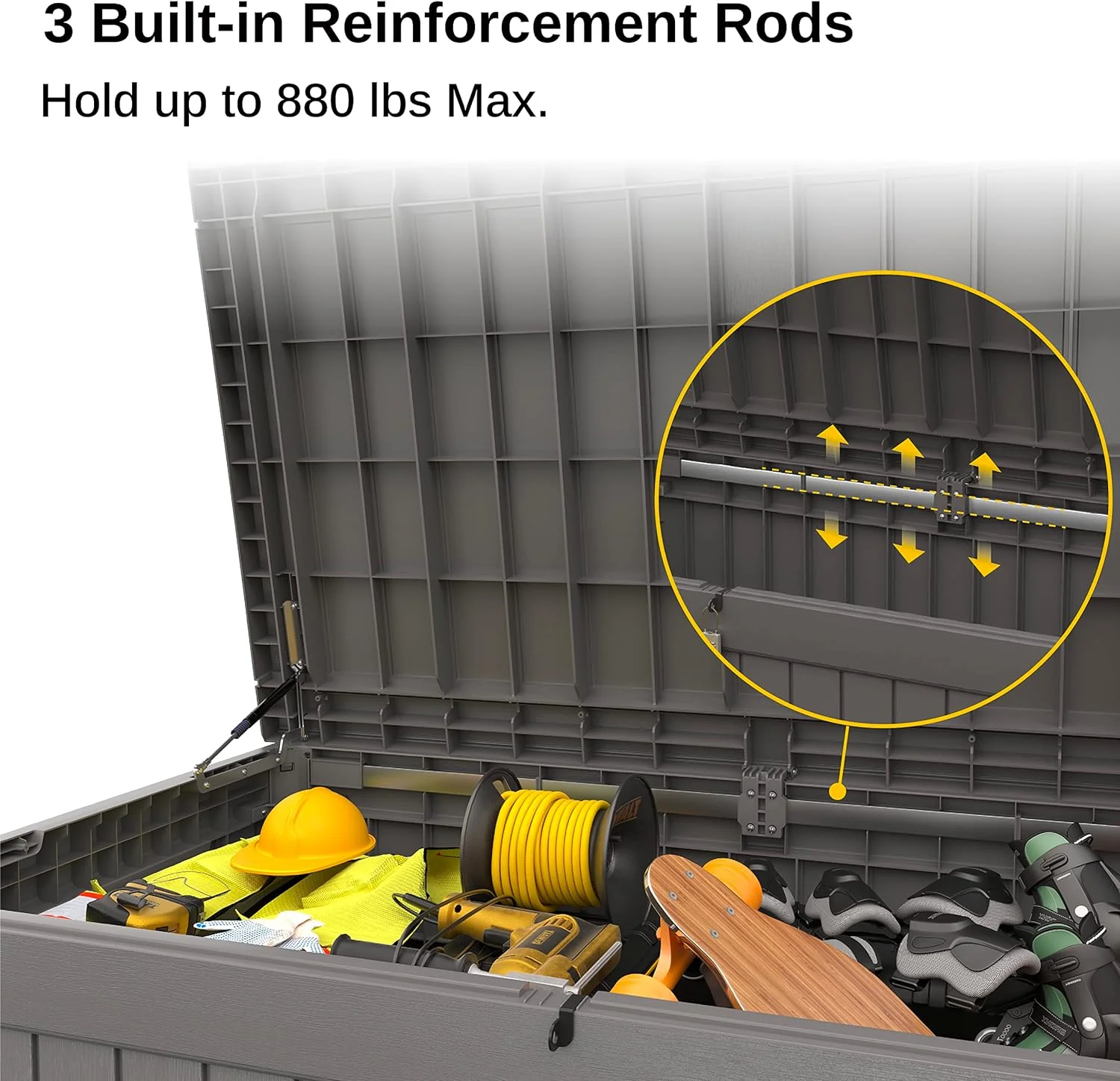 • Excellent Load-bearing Ability: The EAST OAK 230 gallon deck box has built-in three reinforcing rods to ensure that the deck box can carry heavy items without bending or warping under pressure.
