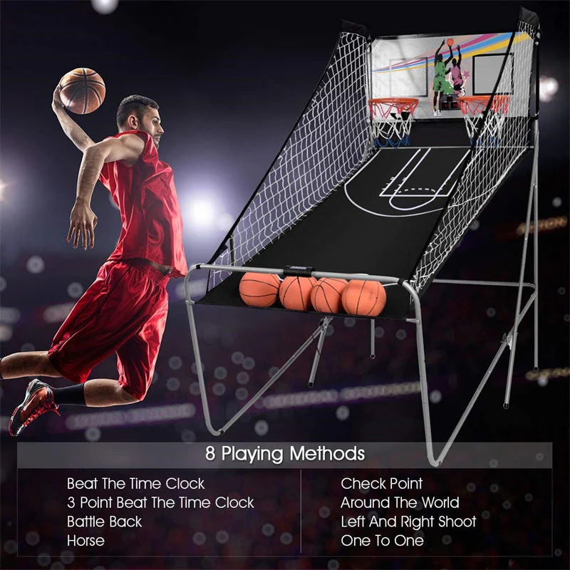 A fun game that will keep you entertained for hours. This foldable indoor double-shot electronic basketball arcade game will bring fun to your home. The 4 rubber basketballs, two hoops, and an electronic scoring board are included for more fun. And coming with infrared optical sensors to ensure accurate and fast scoring. At the same time, with buzzers and sound effects, it can create a real arcade experience. In addition, this foldable basketball arcade game is constructed of durable powder-coated steel, which is durable and sturdy.