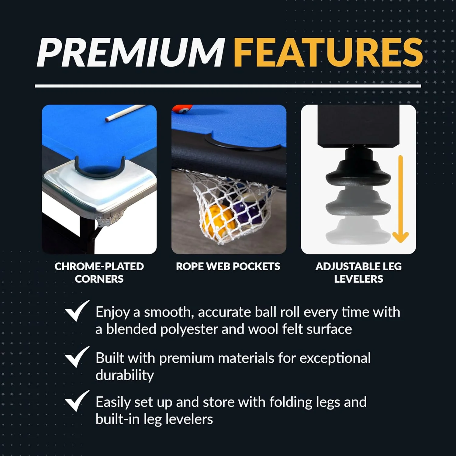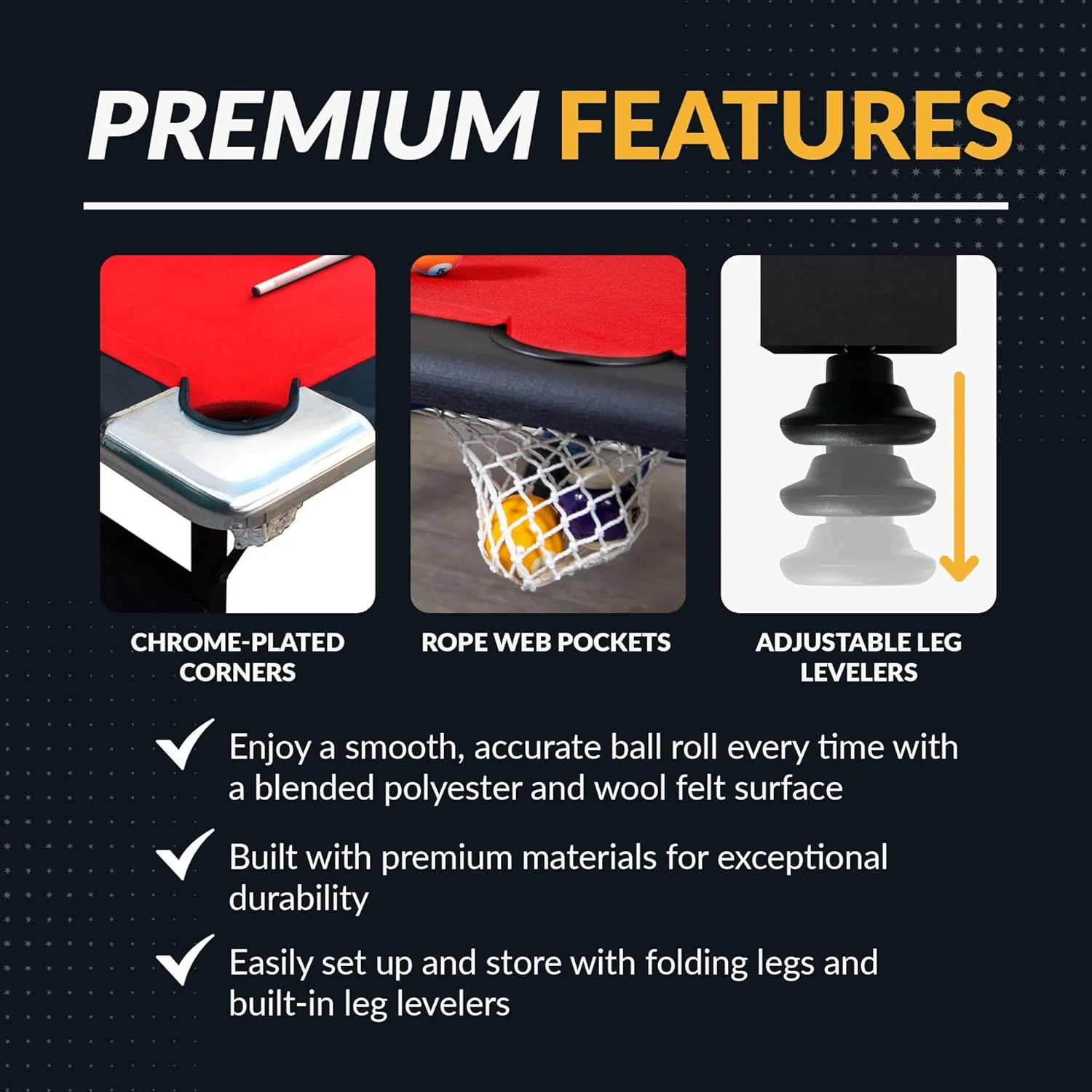 • COMPACT AND PORTABLE DESIGN - Perfectly sized for smaller spaces. the Fairmont Pool Table is easy to move and store. making it ideal for apartments. game rooms. or on-the-go fun. Simply unfold the legs and get the game started.