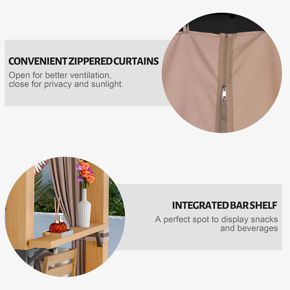 - Equipped with zippered curtains on one side, choose to remove them for optimal ventilation, tie them back for decorative purposes, or fully close them for privacy and sun protection.