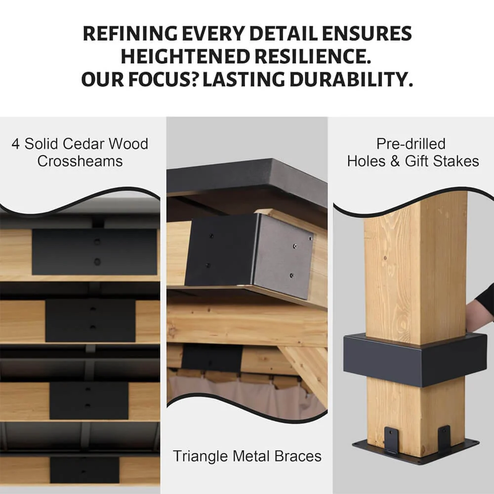 - The gazebo is reinforced with four solid wood beams and triangular metal brackets fixed to the front columns. Additionally, the wooden stakes inserted into pre-drilled holes add extra stability, allowing it to withstand strong winds and heavy snow.