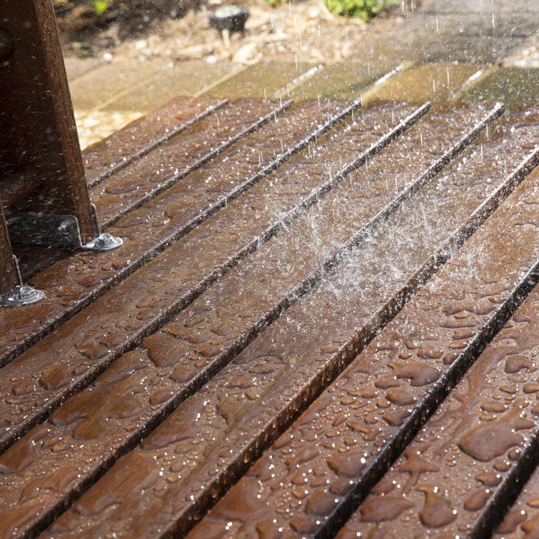 This product leaves the great outdoors in the great with this open-air shower. Rain-Style showerhead luxuriously washes off pool residue and gardening messes. Hardwood slatted base keeps water from collecting and your feet free from the muck. The built-in shelf holds a bar of soap or a towel. keeping all of your shower essentials together. Slight variations in natural hardwood may occur.