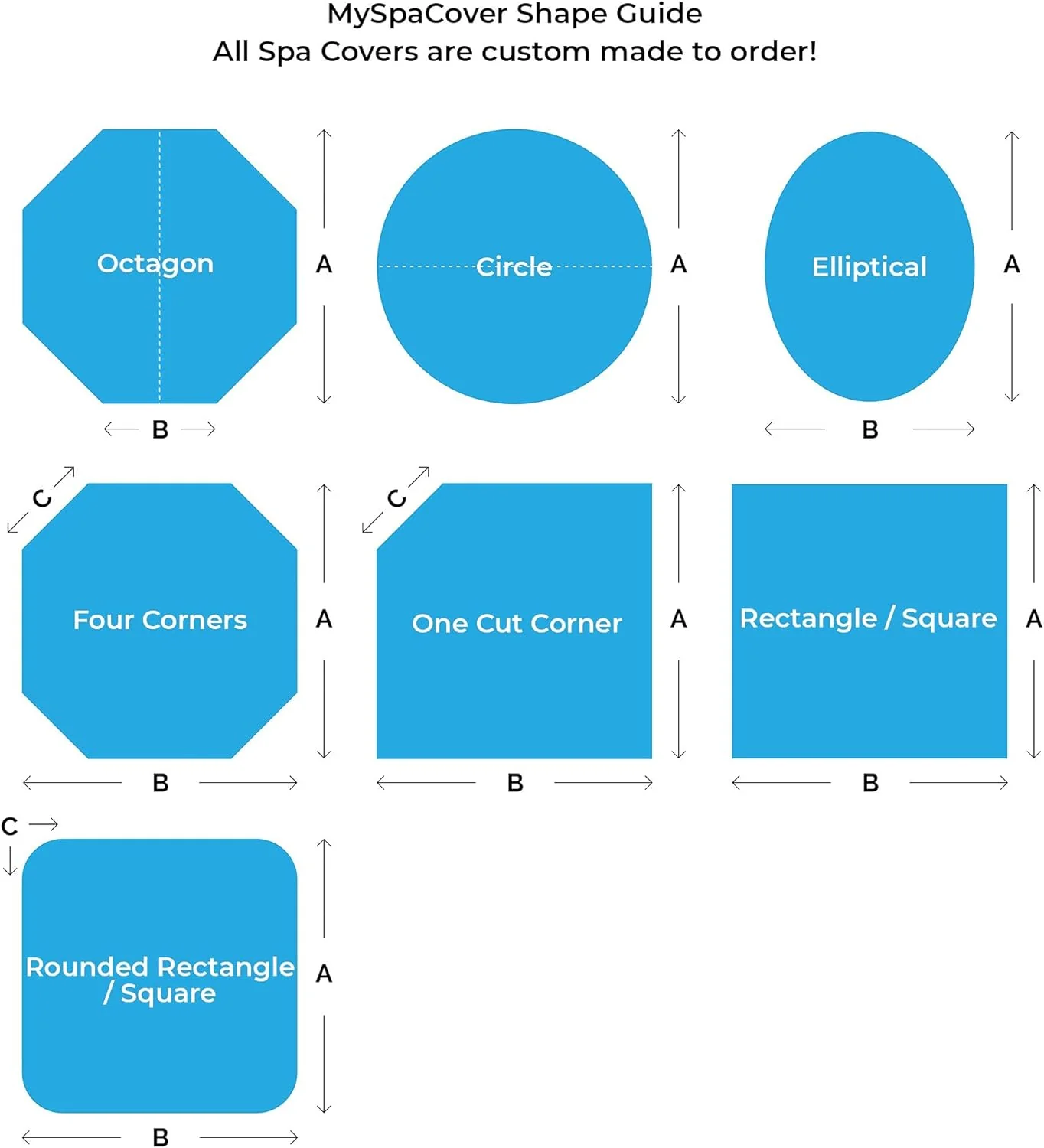 We ensure the durability and quality of our spa covers by utilizing top-notch materials and expert craftsmanship. Our spa covers are constructed with 30oz marine grade vinyl. or Weather Shield material. featuring heavy-duty YKK style zippers and double stitching at every seam. This meticulous attention to detail guarantees a long-lasting and high-quality spa cover that will protect your investment throughout the seasons and years to come. By choosing a MySpaCover replacement spa cover. you not only safeguard your hot tub from damage but also save money in the long run. We prioritize using the finest materials and superior craftsmanship to deliver spa covers that are built to last. As a trusted partner. we have collaborated with renowned hot tub manufacturers in North America and beyond. Through these partnerships. we have compiled a comprehensive proprietary database of replacement spa cover dimensions. This database includes precise measurements for popular brands such as Jacuzzi. Sundance. Hot Spring. Caldera. Cal Spas. Coleman. and many more. We offer over 1000 spa cover models. you'll find the perfect fit for your hot tub. We take pride in our products and offer a 5-year warranty on all our spa covers. However. it's crucial for customers to provide accurate measurements when placing an order. as all our spa covers are made to order based on the information provided. We kindly request that you double-check your measurements before finalizing your purchase. as we are unable to accept returns or provide refunds for items due to customer error. Experience the quality and protection of MySpaCover and make the most of your hot tub investment.