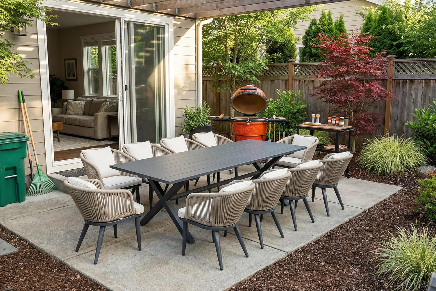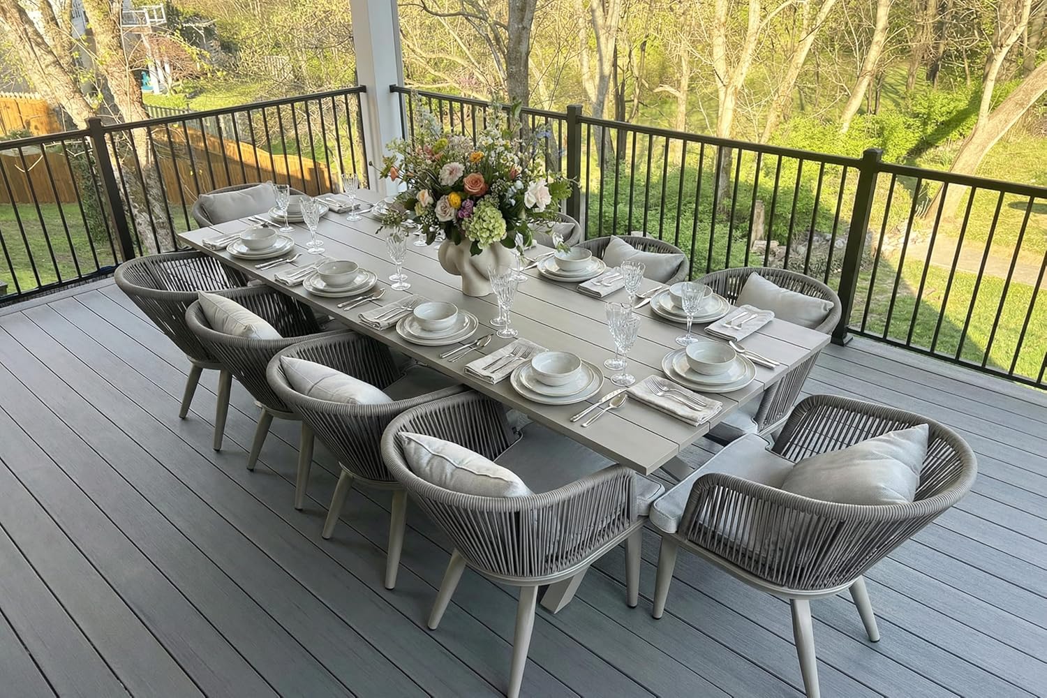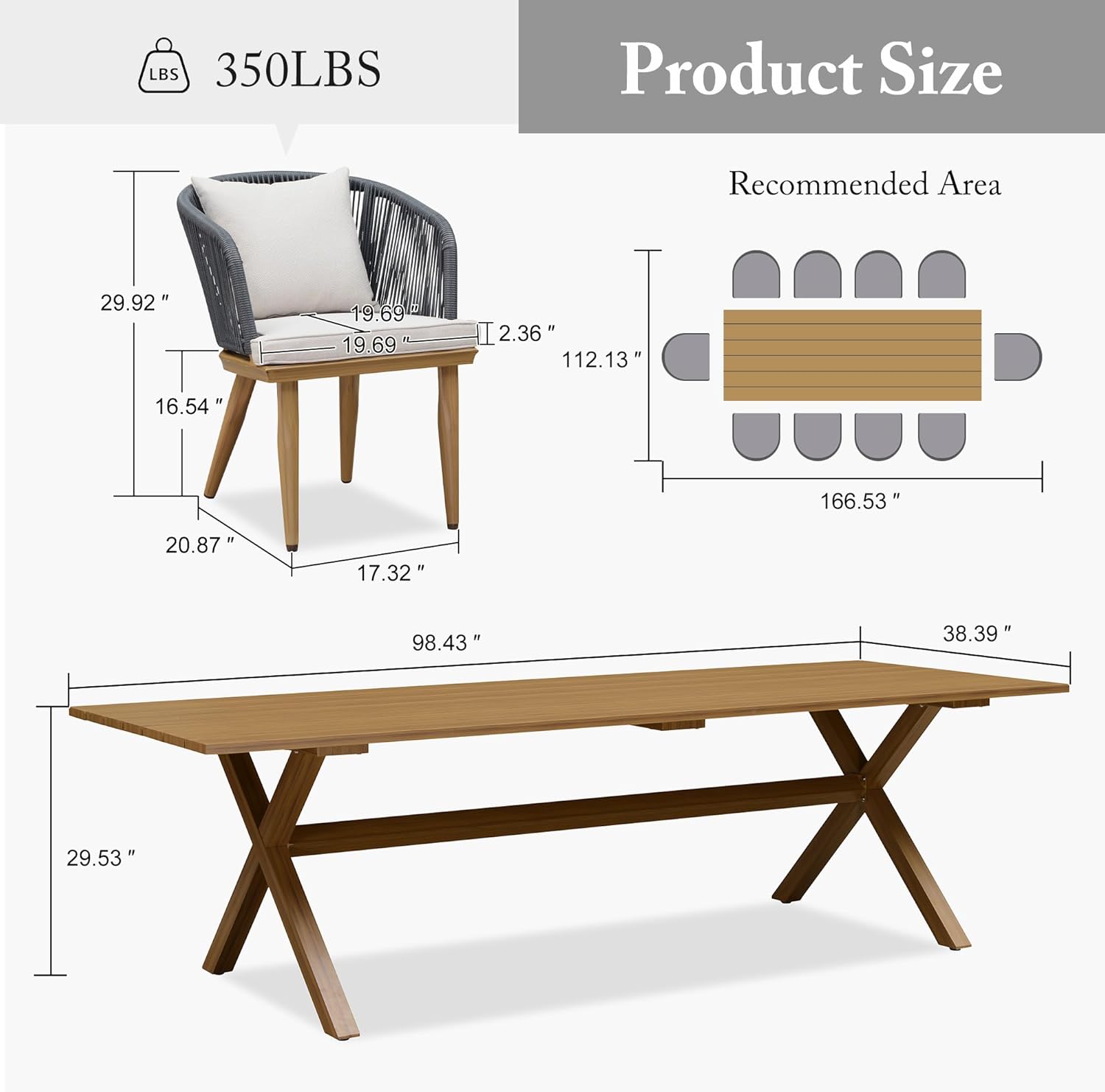 • All-weather taupe dining table set: Includes 1 rectangular table (98.43"L x 38.39"W x 29.53"H) , 10 chairs (19.69"W x 19.69"D x 29.92"H, 16.54"SH ) with 10 seat cushions and 10 back pillows.