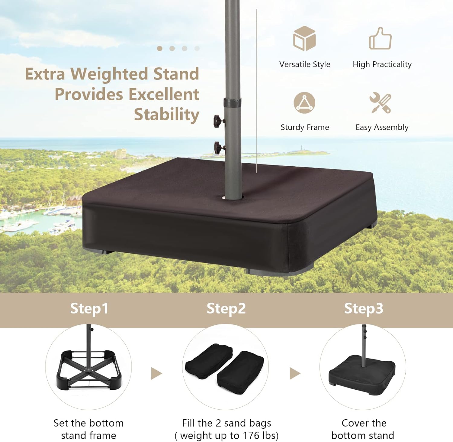 - Solar-powered Illumination: As the sun sets, your outdoor ambiance turns magical with solar-powered lights delicately integrated into the patio umbrella. Offering a soft, ambient glow, these LED lights create the perfect mood for serene evenings under the stars. There are 4 LED lights on each rib.