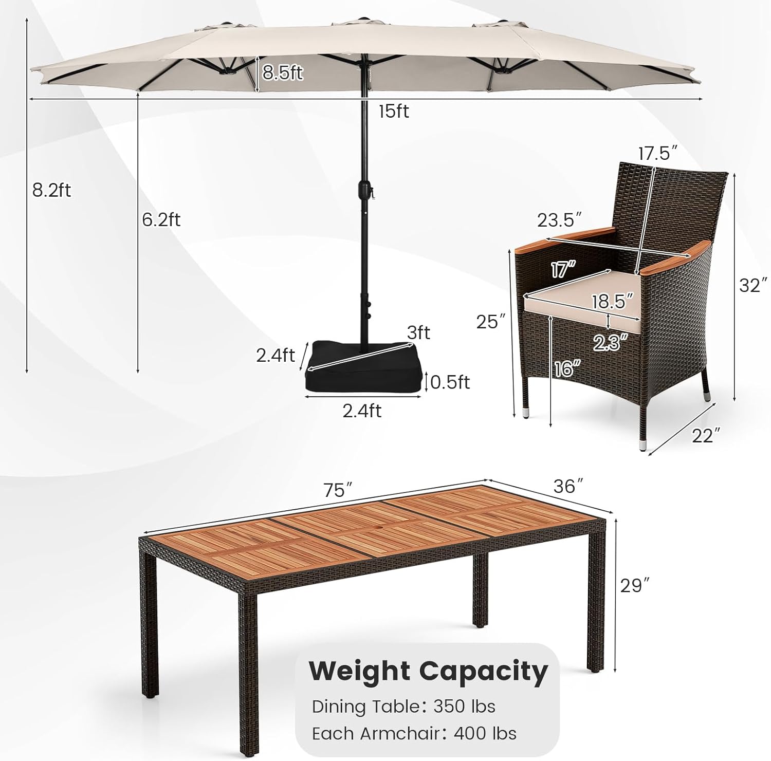 - Durability Meets Design: This patio dining set features fade-resistant PE rattan, solid acacia wood, robust umbrella fabric and metal support, which ensure longevity, meaning more memorable outdoor moments year after year. These materials also bring sophisticated design.