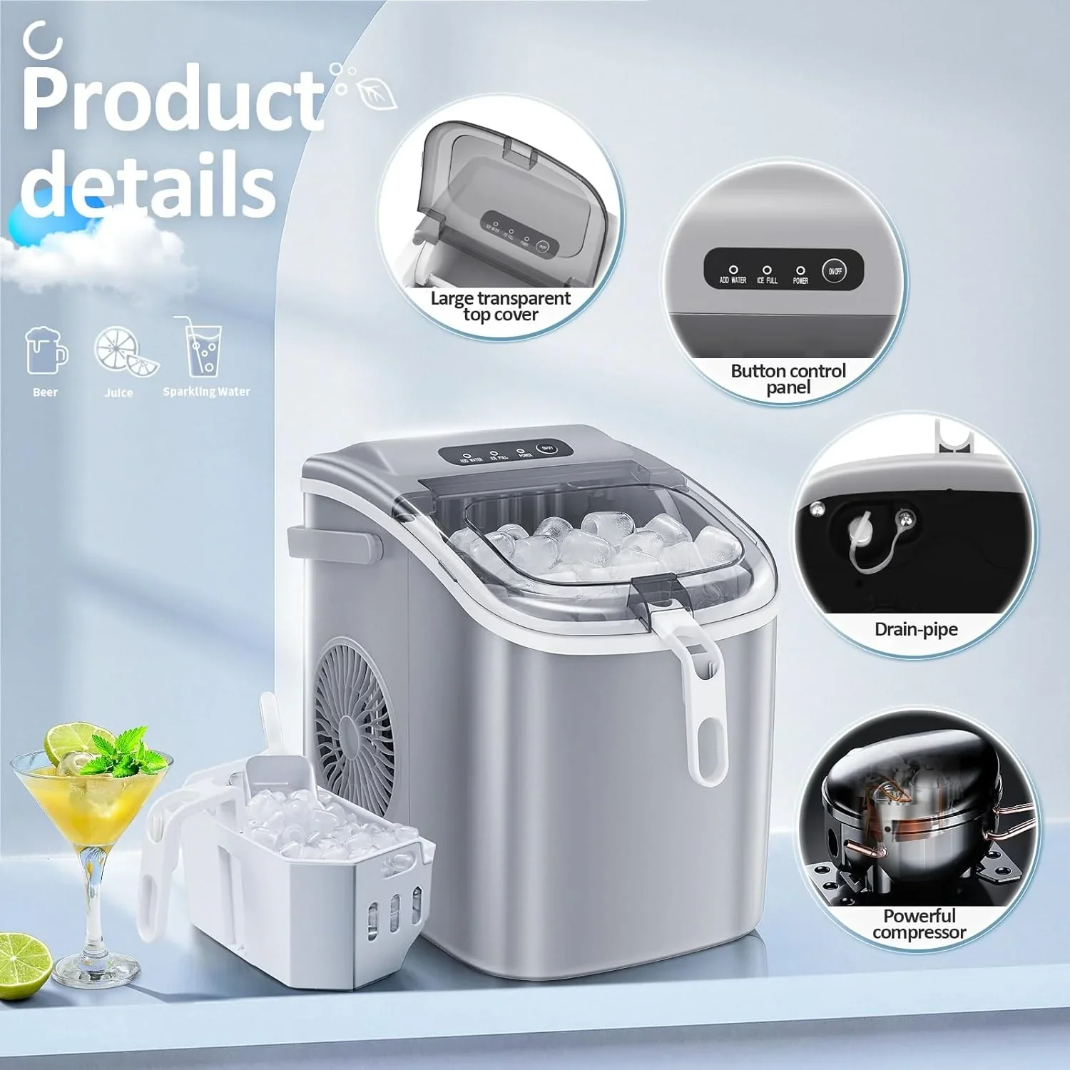 • QUIET AND USER FRIENDLY: It makes ice with low noise. The transparent lid allows you to monitor the ice making process. A considerate ice scoop holder, easy to find your ice scoop before making ice. Only need to press one button, helps you to quickly understand how to use it. When the water is insufficient or the ice basket is full, the indicator light will turn on.