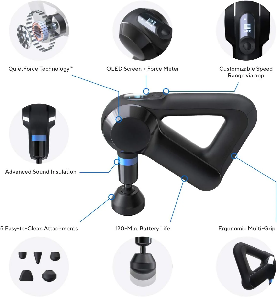 - Personalized Wellness: Alongside the standard ball. thumb. micropoint. and dampener attachements. upgrading to the Elite provides our wedge attachment to round out the attachment lineup. Combine this with 3 built in routines and customizable speed settings for a tailored massage treatment. The patented Theragun Triangle ergonomic handle offers several grips. allowing you to comfortably treat even hard-to-reach places over 80% of your body without strain on the wrist. hands. and arms.